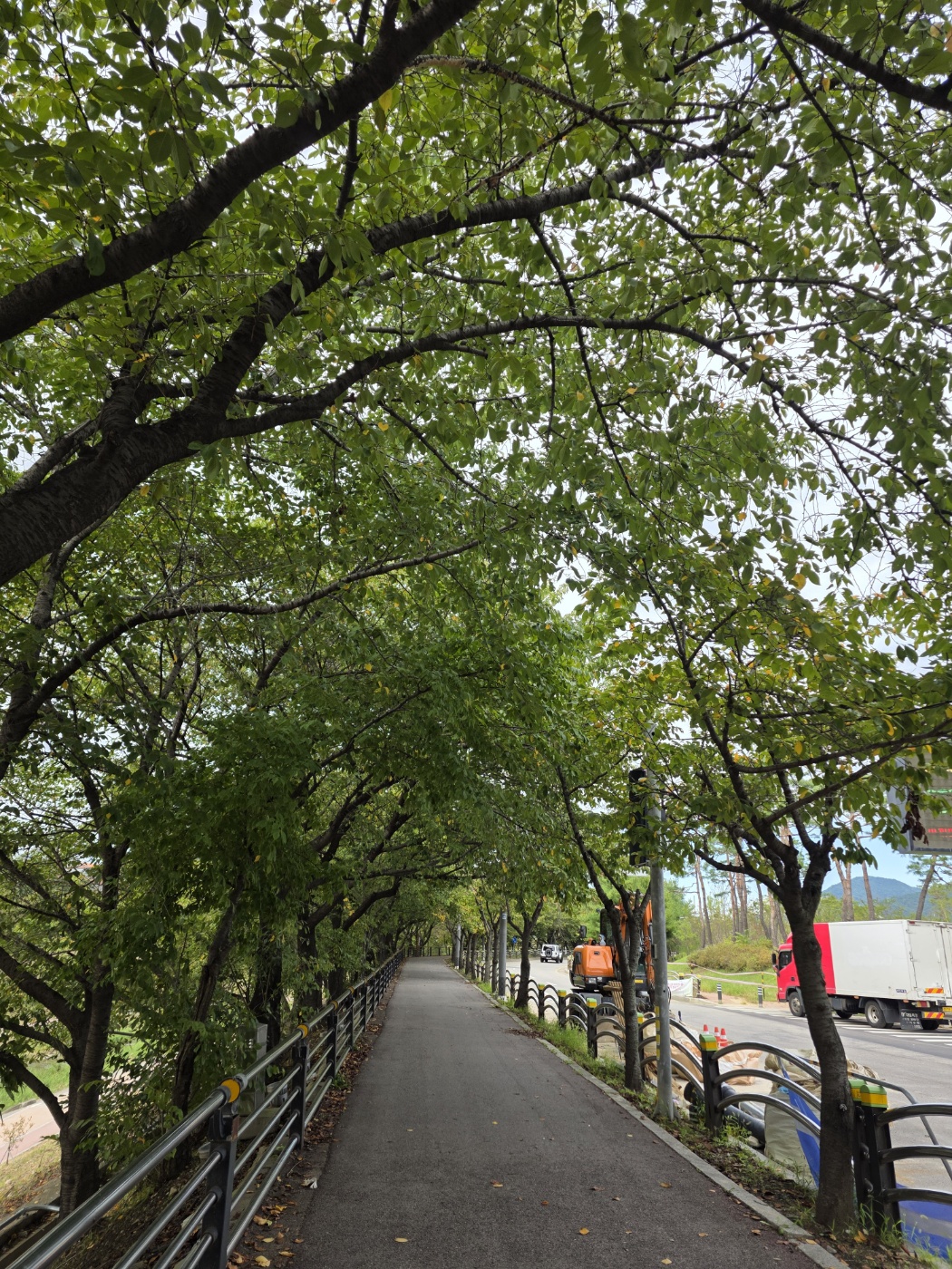 산책하면서 사람들이 없길래 한장 찍어봤네요. 어쩜 나무들이 가지를 길쪽으로 잘 뻗으면서 자라서