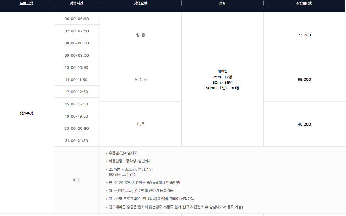 • 일일자유수영 이용자 중 영법 불가능자는 이용불가(월~금 13:00~13:50 25m풀 걷기레인 이용)