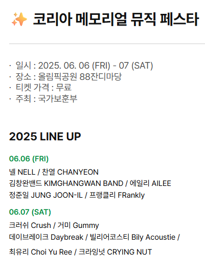 광복80주년을 맞이하여 국가보훈부에서 진행하는 푸드페스티벌이다. 보훈과 음식 문화를 결합한 행사로, 최현석, 정호영, 안유성, 정지선, 이원일, 조광효 등 유명 셰프와 함께하는 광복요리를 만날 수 있는 메모리얼 푸드존 미국, 영국, 캐나다 등 UN 참전 22개국의 요리를 만나볼 수 있는 연대의 식탁 모든 시민들이 참여할 수 있는 자유로운 채색이 가능한 아트월과 야외 피크닉 존, 미션 게임, 사진 촬영, 보훈 놀이터, 사격게임장 등 다양한 체험 프로그램을 즐길 수 있으며, 메인 무대와 피크닉 존에 있는 미니 무대에서 다양한 공연도 만날 수 있다.
