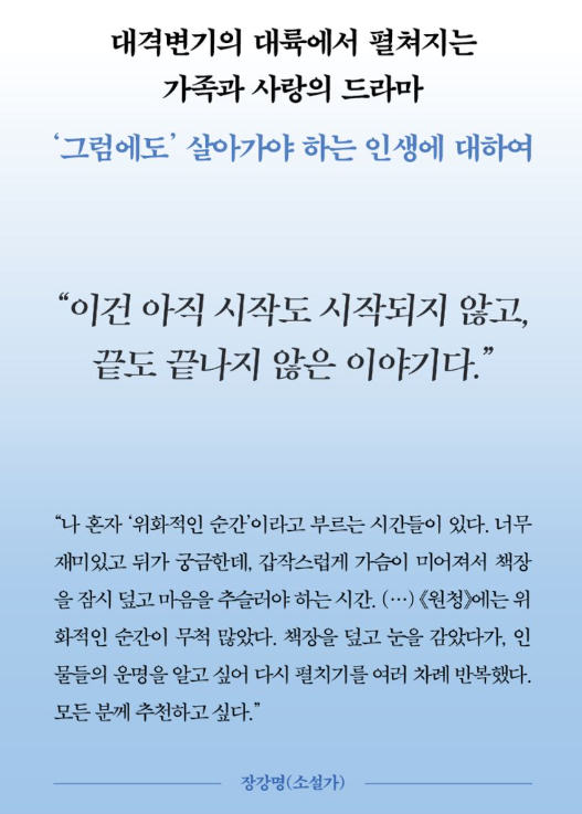 가제본으로 《원청》을 먼저 읽은 국내 독자들 또한 열렬한 찬사를 보냈다. “개인의 운세를 넘어 시대의 운명을 생각하게 만드는 걸작.” “인생을 받아들이는 것이 다만 ‘체념’ 아님을 알려주었다.” “희비극 속에서 끝내 인간을 향한 믿음을 준다.” “마지막 장에서는 도무지 눈물을 참을 수 없었다.” 이처럼 미지의 도시 ‘원청’을 향한 끝없는 모험과 수십 년에 걸친 애절한 로맨스, 그리고 전쟁과 도적으로부터 가족을 지키기 위한 시민의 고군분투가 모두 녹아든 《원청》은 명작에 목마른 문학 독자들에게 분명 시대를 초월한 감동을 선사할 것이다.