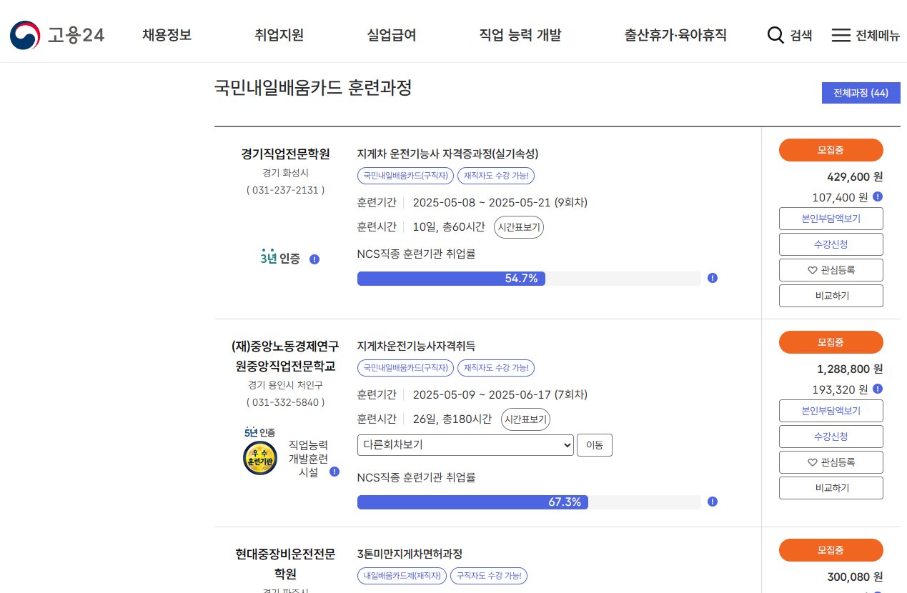 <국민내일배움카드 발급받기- 신청처: 고용노동부 HRD-Net → https://www.hrd.go.kr 접속(훈련과정 찾기-지게차 실기검색)>