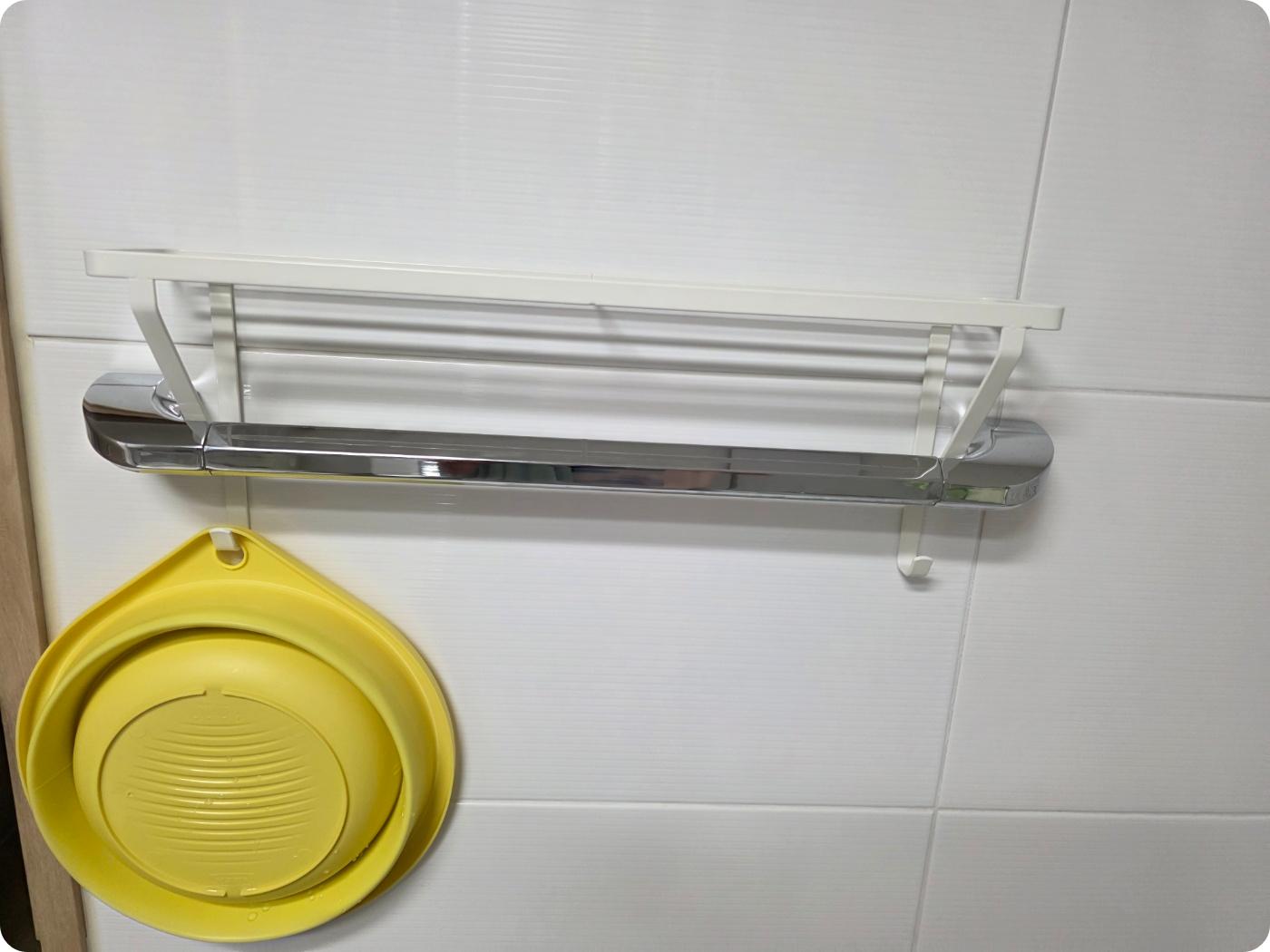 바로 이 제품인데요. 화장실 수건걸이 위에 올려서 사용하는 물품입니다.