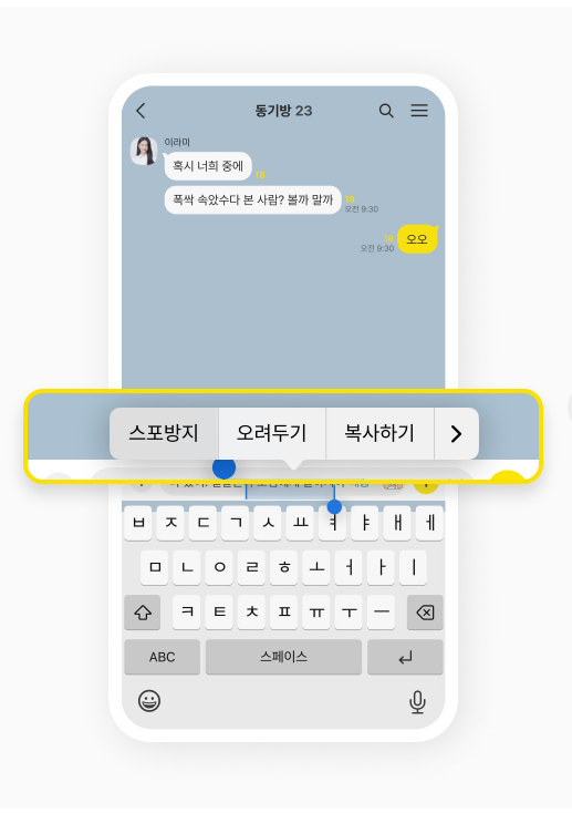 - 친구가 지금 메시지를 입력하고 있는지를 프로필 옆에 노란 점(...)으로 표시해 실시간 대화 흐름을 직관적으로 인지할 수 있습니다.
